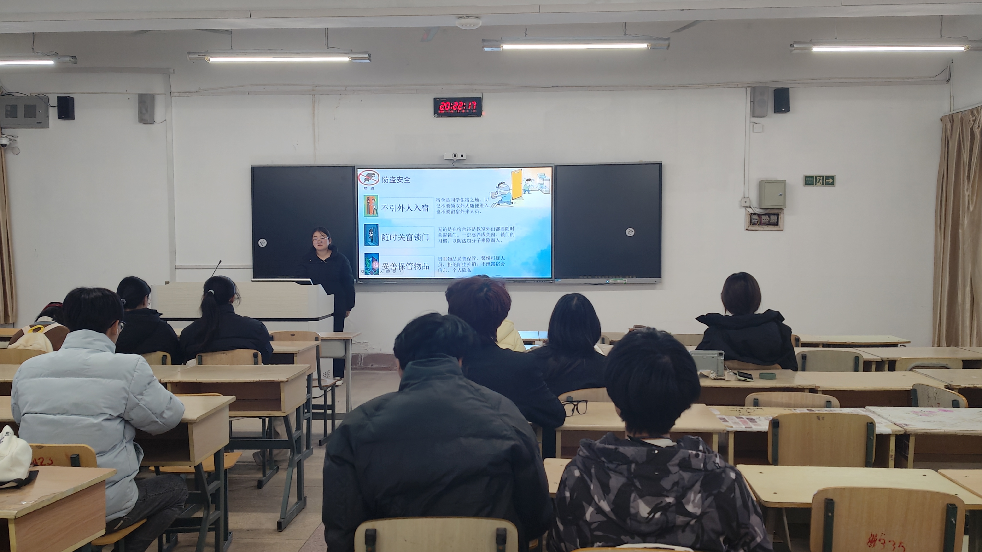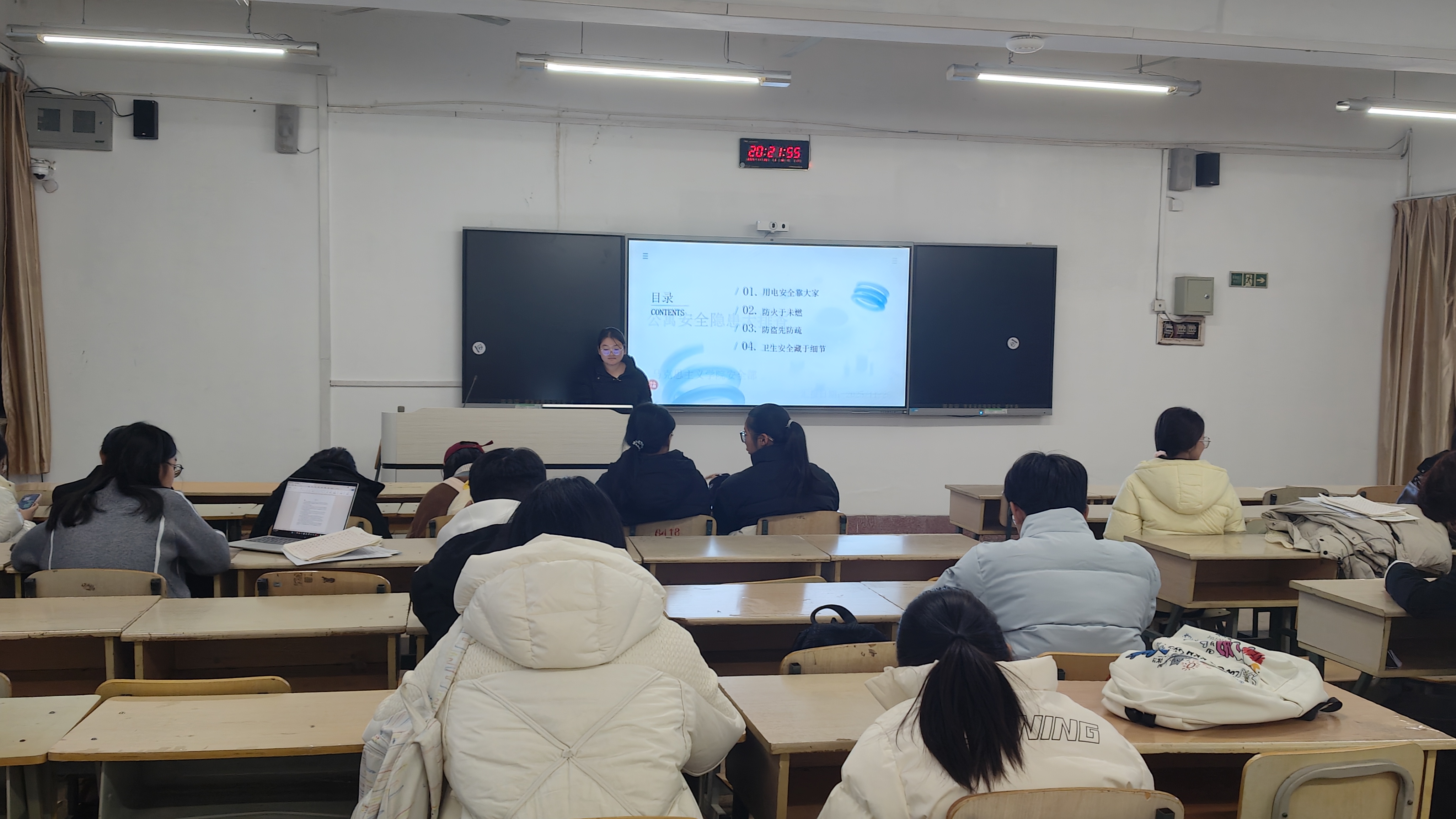 马克思主义学院学生会安全部负责人商庆浩系统讲解了用电、防火、防盗、卫生四大安全领域的防范要点,细致演示灭火器“提拔握压”使用方法、火情初期处置等实用技能,并耐心解答学生关于安全隐患排查的疑问,帮助大家掌握公寓安全防护技能,深化对公寓安全重要性的认知。