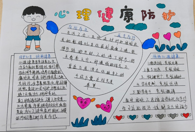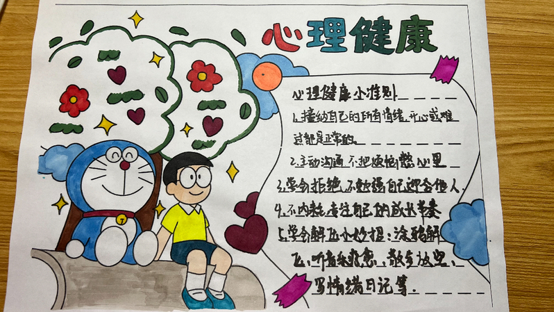 活动中,同学们以笔为媒,让心理健康知识在画纸上“鲜活生长”:有的作品以哆啦A梦等卡通形象为载体,搭配“心理健康小准则”,将情绪调节、压力释放转化为趣味易懂的内容;有的作品以“向阳而生”为核心,用柔和色彩与暖心文字诠释“挫折中寻光”的积极态度;有的作品细化“心理防护实用法”,从情绪调节到日常行动,将心理健康转化为可实践的生活指引;还有作品通过“每日心理清单”等板块,把心理关怀融入点滴日常,让健康理念更接地气。后续,优秀作品将在学院宣传栏、公众号集中展示,让心理温暖辐射更多学子。
