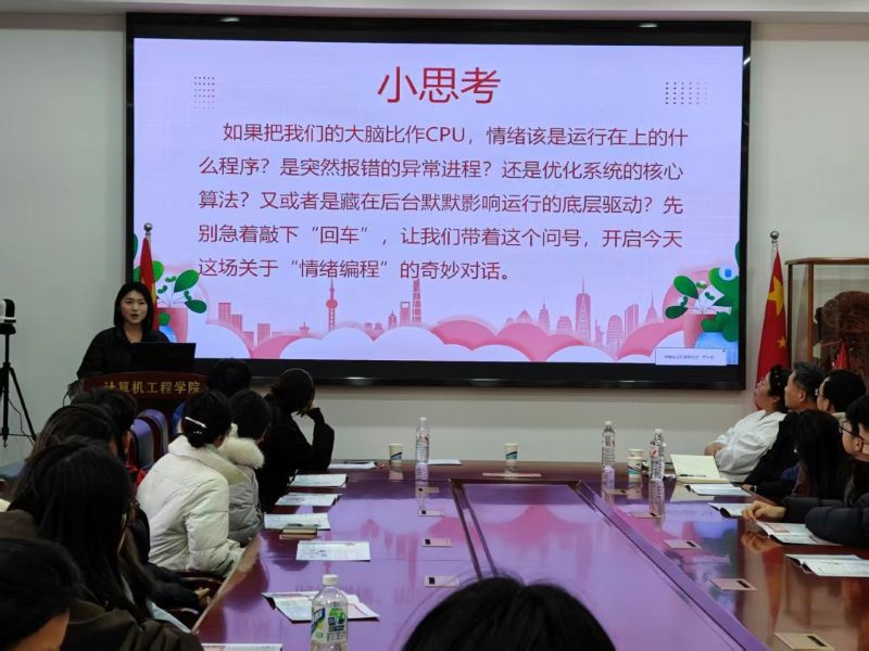 在第三个环节中,23级计算机科学与技术专业优秀学生干部代表池嘉妍、姚心雨以《“编织情绪”谱写心灵算法》为主题,现场演示融合计算机算法特色的心理健康主题班会。