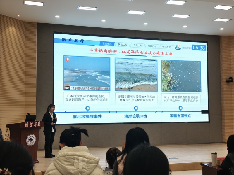 本届大赛设有成长、就业等多个赛道,覆盖全校,竞争激烈。赛前,学院针对赛事开展专题培训,组建指导团队,从职业定位到实施路径,对参赛方案进行多轮打磨,细致优化展示环节,全力为选手备赛提供支持。比赛中,我院选手沉着发挥,充分展现了专业素养与职业潜力。其中,2023级海洋渔业科学与技术专业刘雪婷同学,在成长赛道中稳步晋级,最终荣获银奖;2023级生物科学专业李紫同学在就业赛道突破重围,成功跻身十六强。