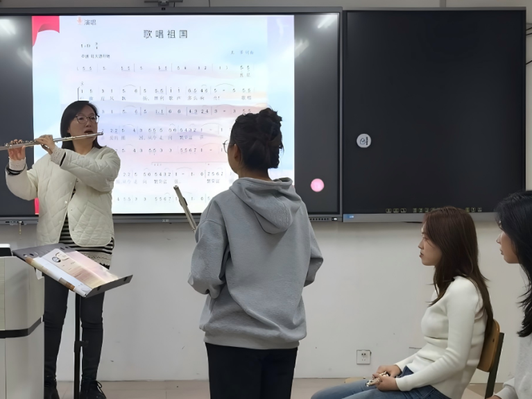 陈苗老师以长笛演奏中学课本爱国歌曲为核心授课内容,精选《我爱你,中国》《歌唱祖国》《红旗飘飘》等经典红色曲目,精准讲解颤音控制、进行曲节奏把控等核心技巧,同步深挖曲目背后的时代背景与家国情怀,引导教师掌握“技能夯实-思政深耕-教学转化”的教学逻辑,助力设计适配中学生认知的互动式教学方案。