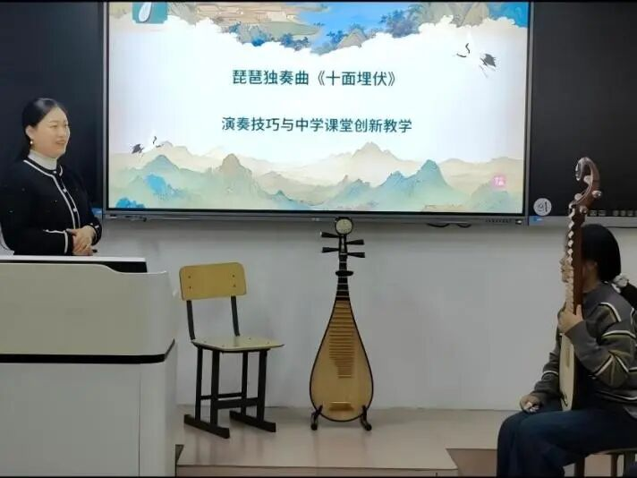 孟娟老师聚焦中学课本中国古曲教学,以琵琶独奏曲《十面埋伏》为授课重点,拆解组合指法、挑轮、扫弦等核心演奏技巧,结合楚汉垓下之战的历史故事解读乐曲精神内涵,示范如何将传统器乐技艺与中华优秀传统文化传承、民族精神培育有机结合,为古曲课程思政教学提供可借鉴的实践路径。