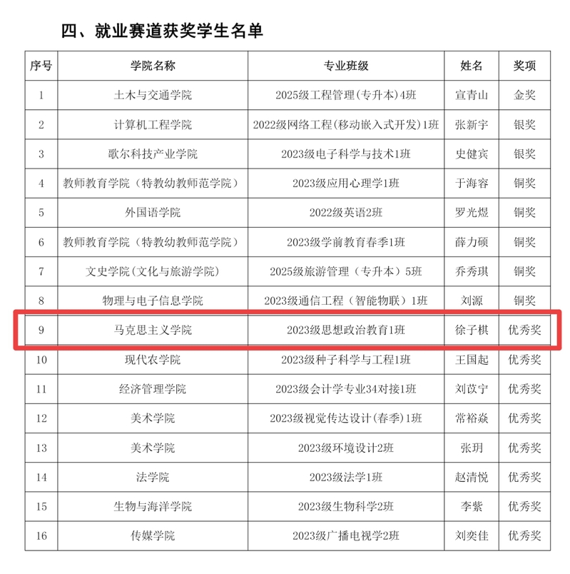 此次获奖,既是对马克思主义学院学生专业能力与职业规划素养的充分肯定,也是马克思主义学院深化育人改革、推动学业与职业有机衔接的生动实践成果。下一步,马克思主义学院将持续深化职业规划教育,帮助学生明确发展方向、提升综合素养,为培养时代新人添砖加瓦。