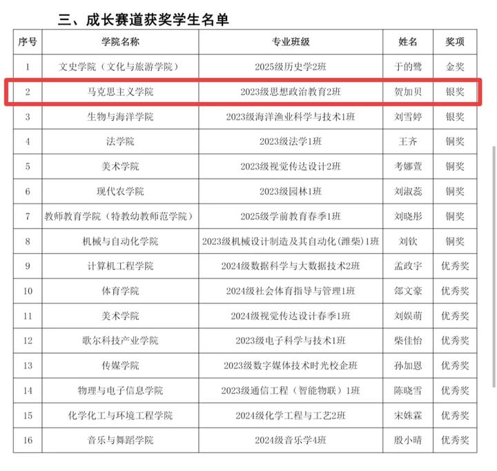 12月11日,潍坊学院第六届大学生职业规划大赛圆满落幕。马克思主义学院学生凭借坚定的理想信念、扎实的专业功底与清晰的职业规划,在众多参赛选手中脱颖而出,斩获多项荣誉:2023级思想政治教育2班贺加贝同学在成长赛道中荣获银奖;2023级思想政治教育1班徐子棋同学在就业赛道中喜获优秀奖;张予甯老师获评“优秀指导教师”。