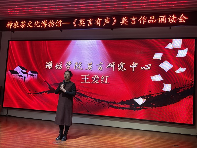 为推动莫言文学作品的大众化传播与深度解读,搭建文学与艺术的跨界交流平台,12月13日,“莫言有声”莫言作品诵读会在潍坊成功举办。本次活动由潍坊市文艺两新发展促进会、潍坊市文艺评论家协会、潍城区作家协会联合主办,潍坊学院文史学院莫言研究中心、神农茶文化博物馆共同承办,潍坊朗诵与语言艺术协会协办。文史学院莫言研究中心陈金芳、王爱红、梁成帅三位老师参加活动,王爱红老师登台分享作品解读。