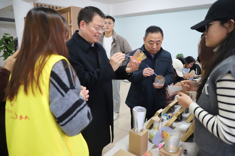 走进学生宿舍区,校领导专程探访考研宿舍,为备战学子送上“考研加油礼包”,亲笔写下励志寄语,鼓励大家坚定目标、沉着应考。在标杆宿舍,面对整洁规范的内务整理成果,任立春勉励同学们携手共建文明和谐的居住环境。走访途中,轻健身空间内体育学院学生的专业运动演示、创意沙龙室里趣味盎然的手工DIY、师生会客厅中暖心治愈的心理拼贴诗创作,全方位展现出社区空间功能的丰富性与人文温度。