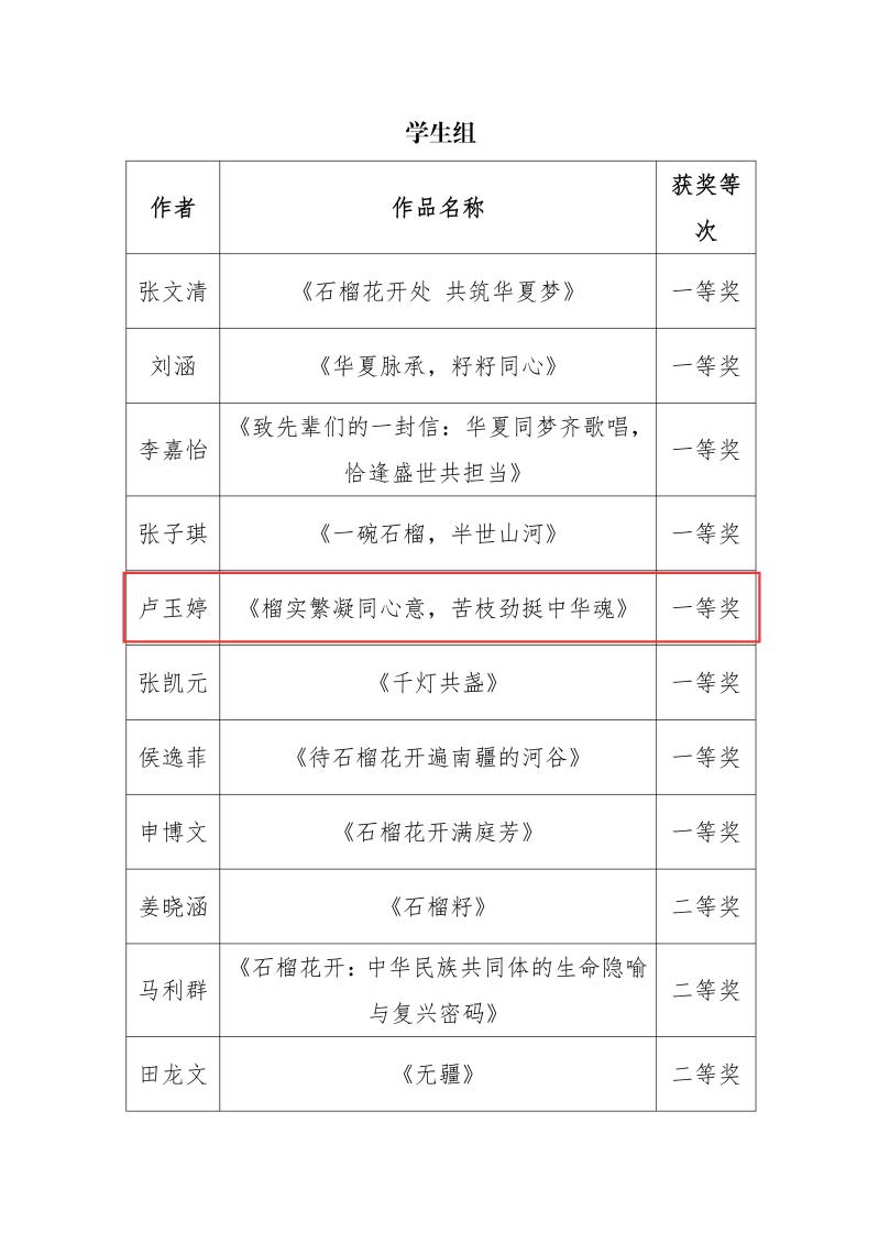 为深入学习贯彻习近平总书记关于铸牢中华民族共同体意识的重要指示精神,引导师生厚植家国情怀,12月25日,文史学院积极组织参与由党委宣传部、党委统战部等六部门联合举办的“石榴花开同心筑梦,华夏脉承聚力兴邦”主题征文活动,学院获得教工组三等奖1项,学生组一二三等奖各1项,学院获评“优秀组织单位”。