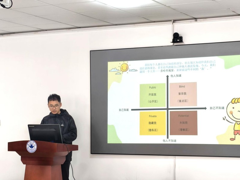 活动伊始,杨宗祎以自我探索、心灵觉醒为主题,系统讲解乔哈里窗理论,深入阐释 “公开我、盲目我、隐藏我、未知我” 四个维度的核心要义,引导学生建立客观、完整的自我认知框架,为后续实践环节奠定坚实理论基础。