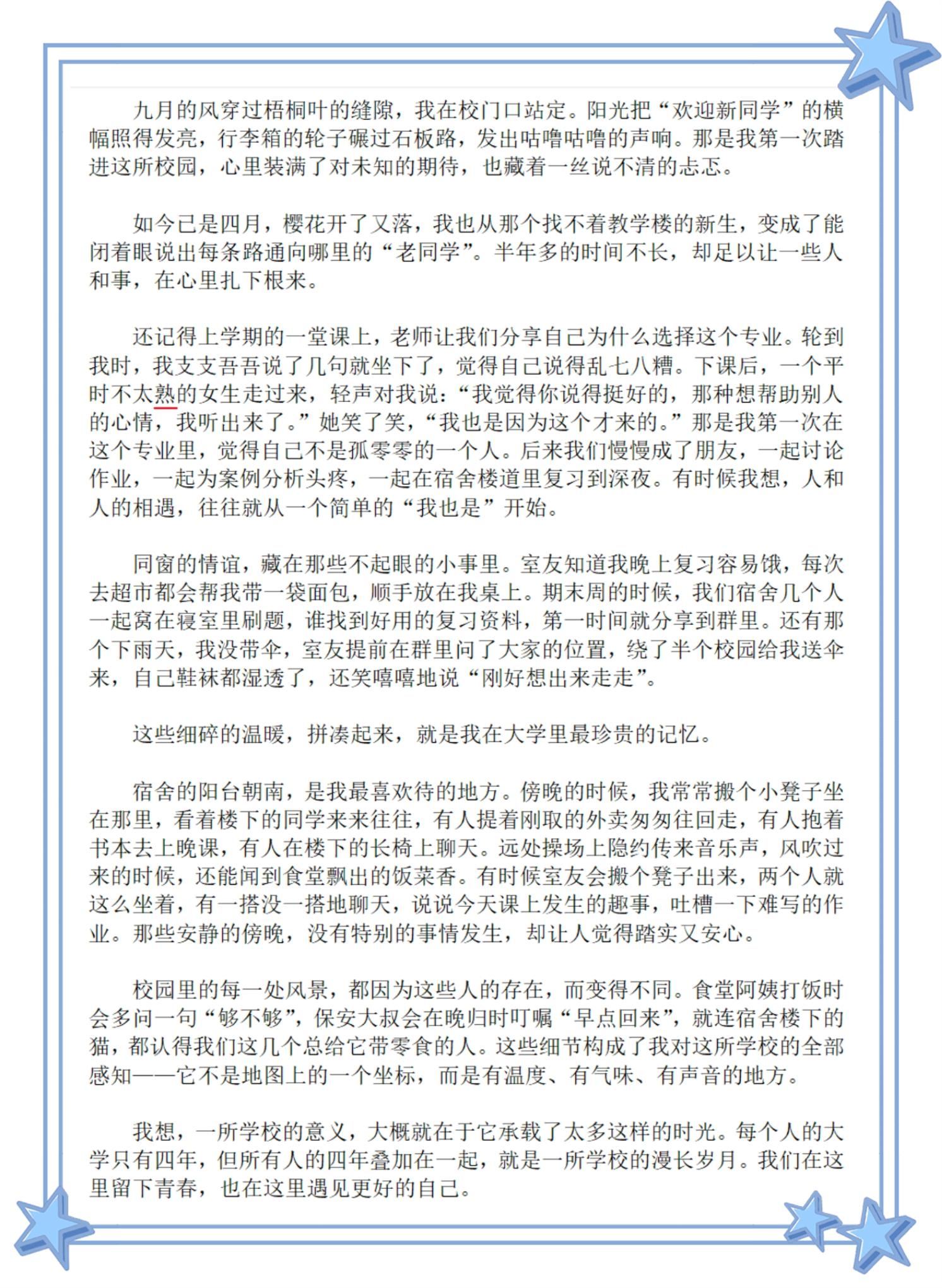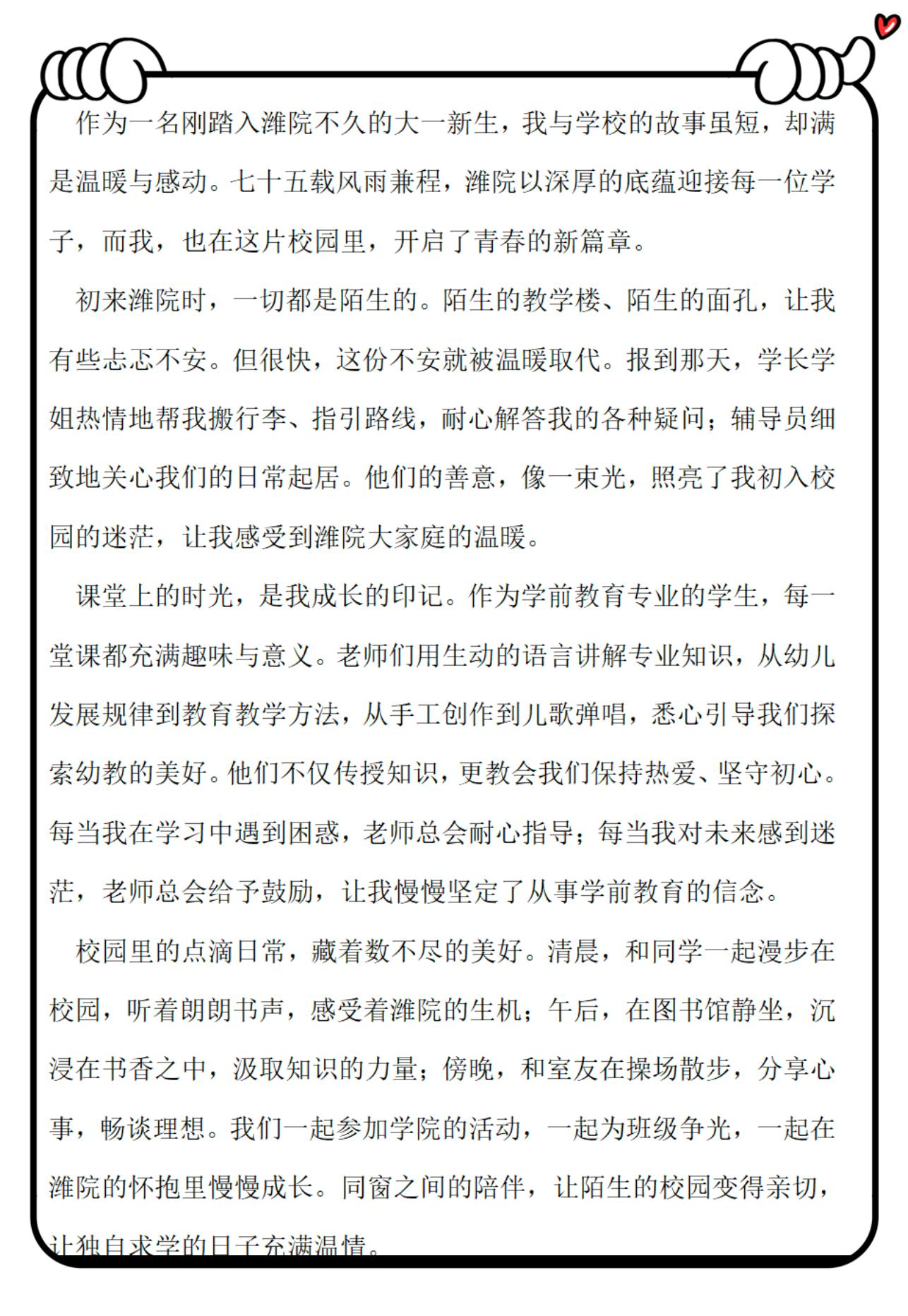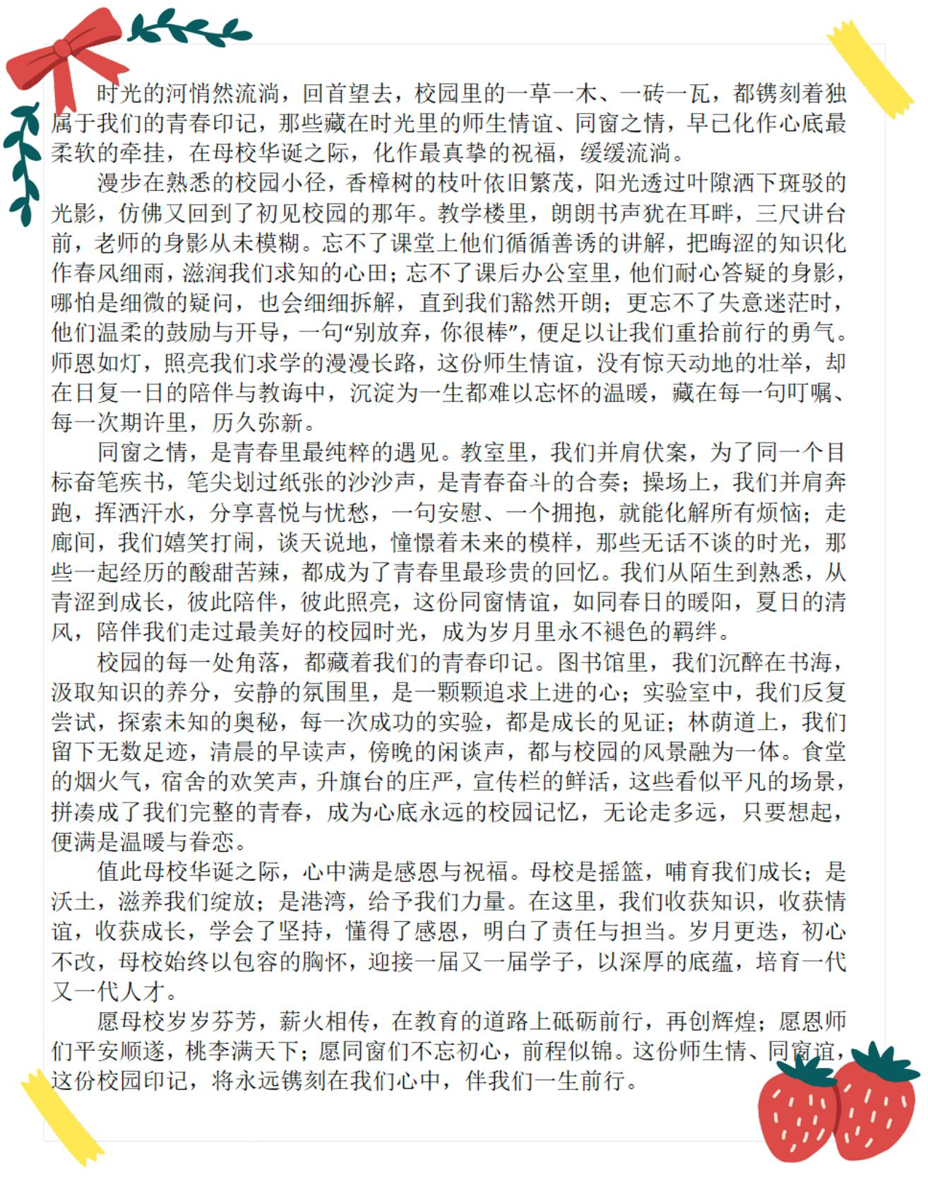 活动全程依托线上平台开展,自通知发布以来,便得到了学院全体学子的热烈响应与踊跃参与。同学们围绕师生情谊、同窗相伴、校园成长、青春奋斗、校庆寄语等多元主题,用心书写在潍院的点滴故事与独家记忆。从初入校园时的懵懂与憧憬,到课堂上的深耕求索、教室里的反复钻研;从宿舍里的朝夕相伴、社团中的并肩成长,到校园角落的温暖邂逅、恩师引路的人生启迪,每一份作品都饱含真情、笔触鲜活,将青春岁月与学校发展紧密相连,让办学温度、人文底蕴在字里行间得以生动呈现,尽显新时代学子的青春风貌与爱校之心。