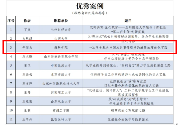 近日,2025年高校思想政治工作优秀文章征集结果公示发布,我校辅导员于丽杰老师撰写的《一次学生私自出国旅游事件引发的班级治理优化实践》案例,获评优秀案例。