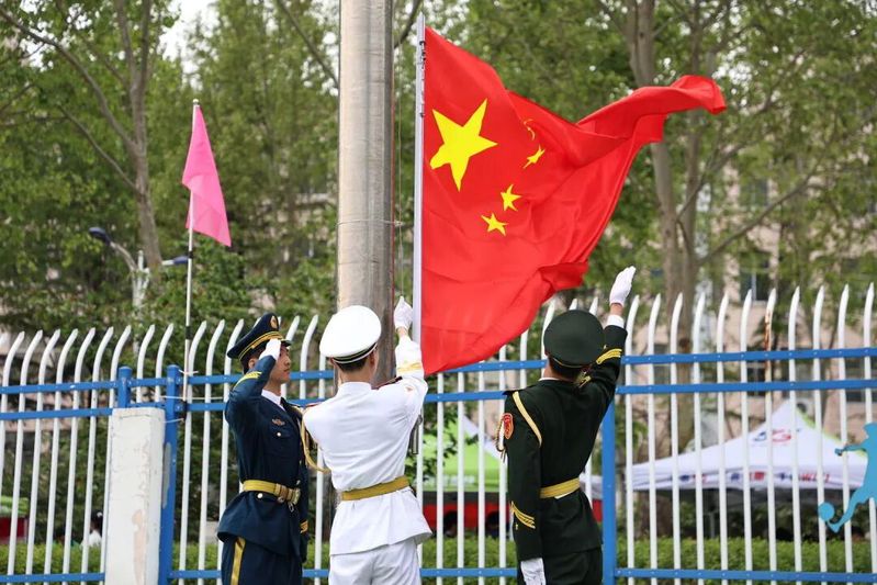 升旗仪式上,国旗护卫队护送五星红旗入场,在全体师生的注目中,国旗冉冉升起,迎风飘扬。礼毕后,校领导发表讲话,寄语全体同学以本次运动会为契机,强健体魄、锤炼意志,在竞技中凝聚团队力量,在拼搏中展现青春风采,严守规则、尊重对手,以饱满热情与昂扬姿态参与其中,同时祝愿本届运动会顺利举办、圆满落幕。
