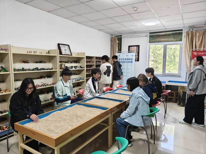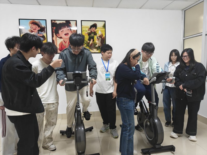 随后,在志愿者的引导下,同学们依次参观体验了心理沙盘室、心理智慧解压室、个体放松室与心理宣泄室等功能区域。在心理沙盘室,同学们通过摆放沙具、构建沙盘场景,在志愿者的专业讲解下探索内心世界,感受沙盘游戏带来的心理疗愈;在心理智慧解压室,室内的动感单车器材,是运动与心理减压结合的特色体验,让同学们在骑行运动中促进多巴胺分泌,在挥洒汗水的同时缓解心理压力,实现身心同步放松;团体放松室里,舒缓的音乐与舒适的环境帮助同学们暂时卸下疲惫,实现身心放松;而心理宣泄室则为同学们提供了安全的情绪释放空间,让同学们通过合理方式宣泄内心的焦虑与烦躁。每到一处,志愿者都耐心讲解设备功能与使用方法,让同学们在亲身体验中感受心理服务的专业与温暖。