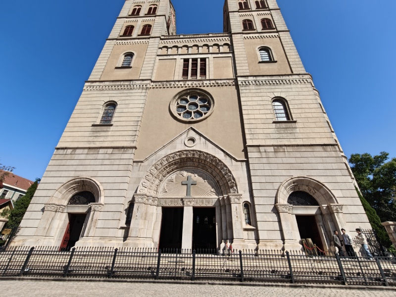 首站抵达栈桥,这座见证青岛百年变迁的地标建筑,以花岗岩桥体与中国传统风格的回澜阁构成独特景观。同学们在带队教师指导下,细致观察其从军用码头到文旅地标的功能演变,深入研讨空间活化利用技巧。随后在中山路纪念馆与圣弥厄尔教堂,师生重点剖析近代建筑中中西文化的融合路径,记录哥特式尖顶、雕花窗棂等经典元素的设计逻辑。