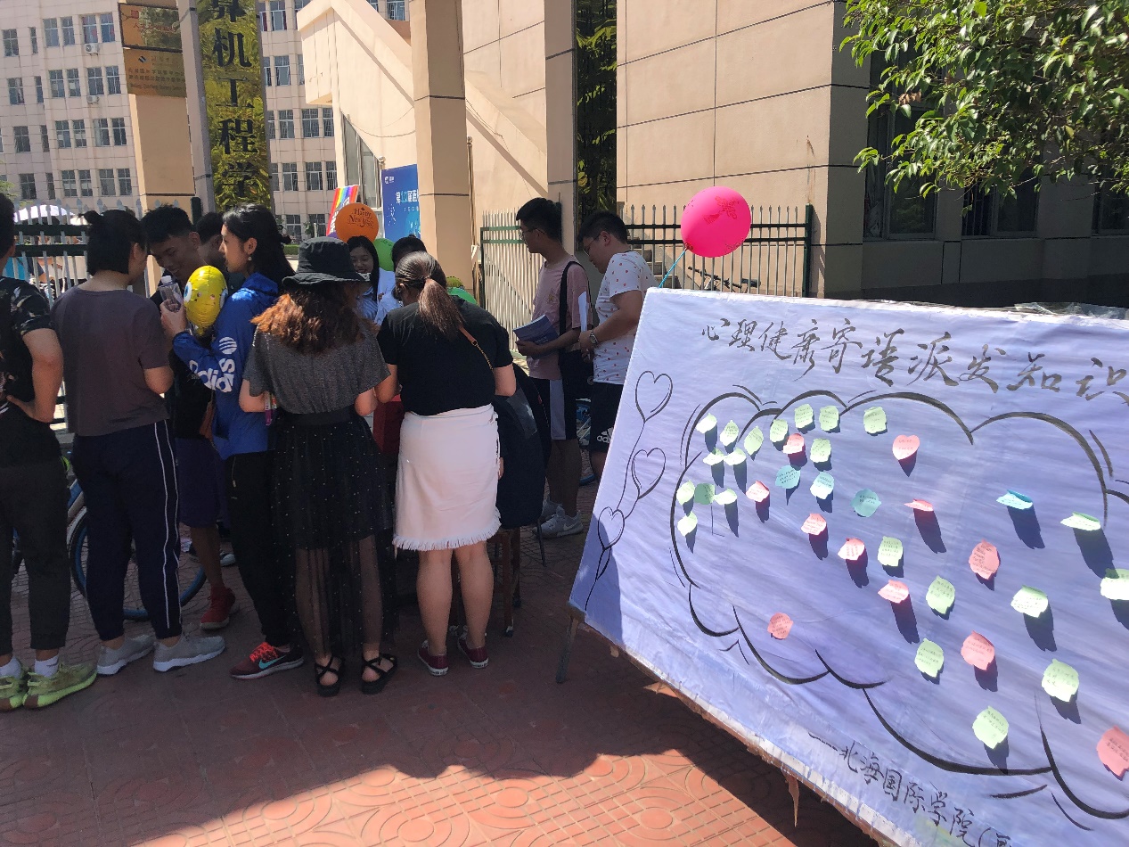 来自北海国际学院(歌尔科技学院)学生会的工作人员会在活动前夕,准备数张心理健康语小纸条,随机发放给同学们,设立心灵物语展板,并有工作人员发放便利贴,鼓励同学们写出自己的高兴,烦恼,吐槽以此释放压力,大胆说出自己的心声。为鼓励同学们积极参,设置有奖竞答环节,增送精美礼品,保证活动普及心理健康知识的同时,活动又具有很大的趣味性。活动受到了广大同学的好评。